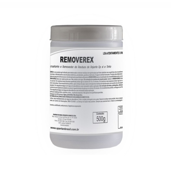 Removerex da Spartan é um produto gel indicado para desincrustar e remover resíduos de rejunte epóxi que ficam aderidos nas superfícies dos revestimentos. É também ideal para remoção de tintas (base água e óleo), pichações, silicones e vernizes. Indicado para o uso em pisos cerâmicos, porcelanatos, granitos e mármores. É seguro e de fácil manuseio. Produto não inflamável.